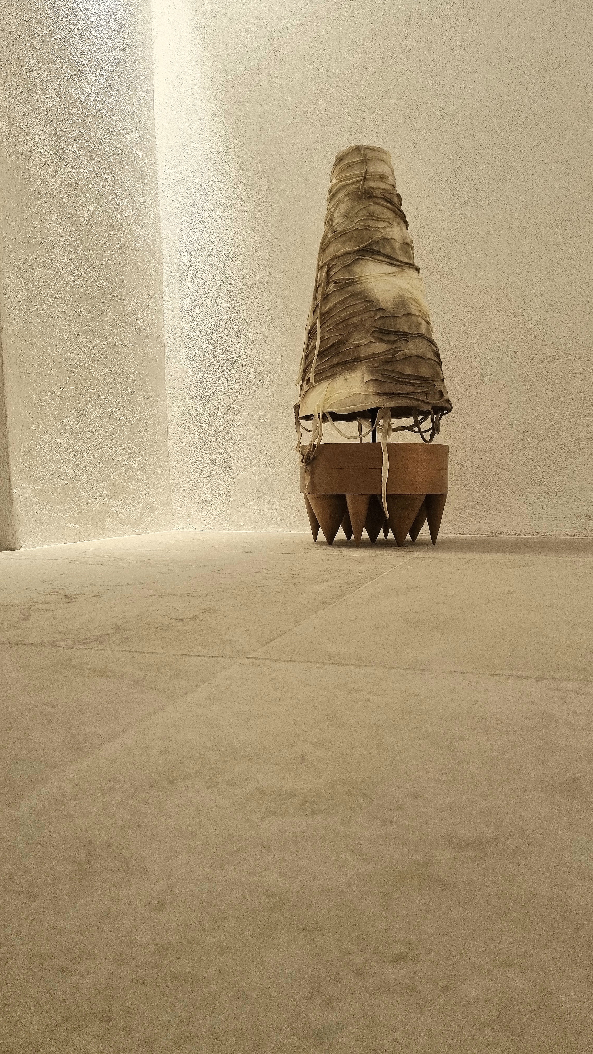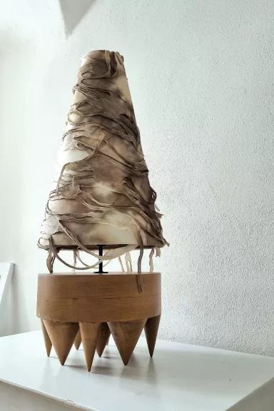 A solid wooden base with sharp conical spikes and an organically layered textile shade in natural tones