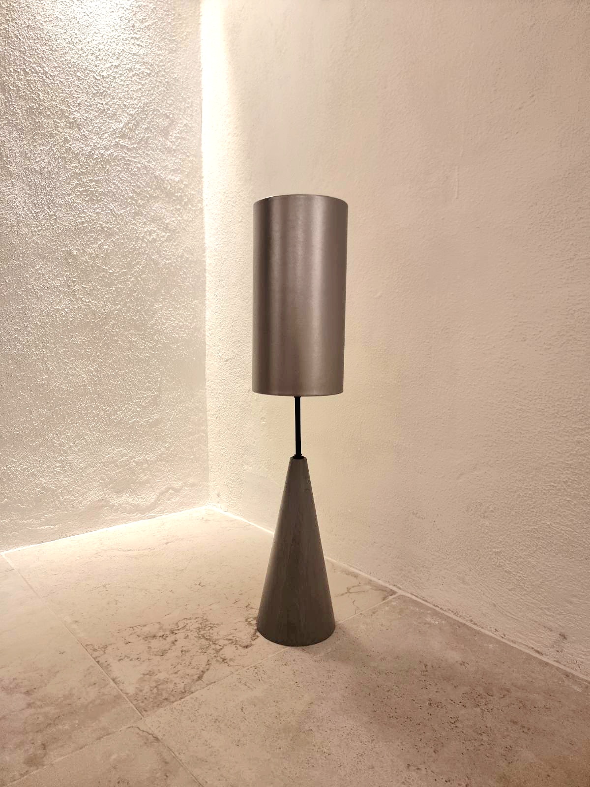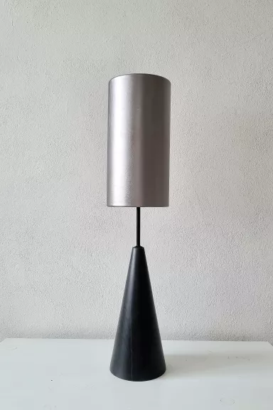 The lamp combines an elegant silver leather shade with a black beech wood base