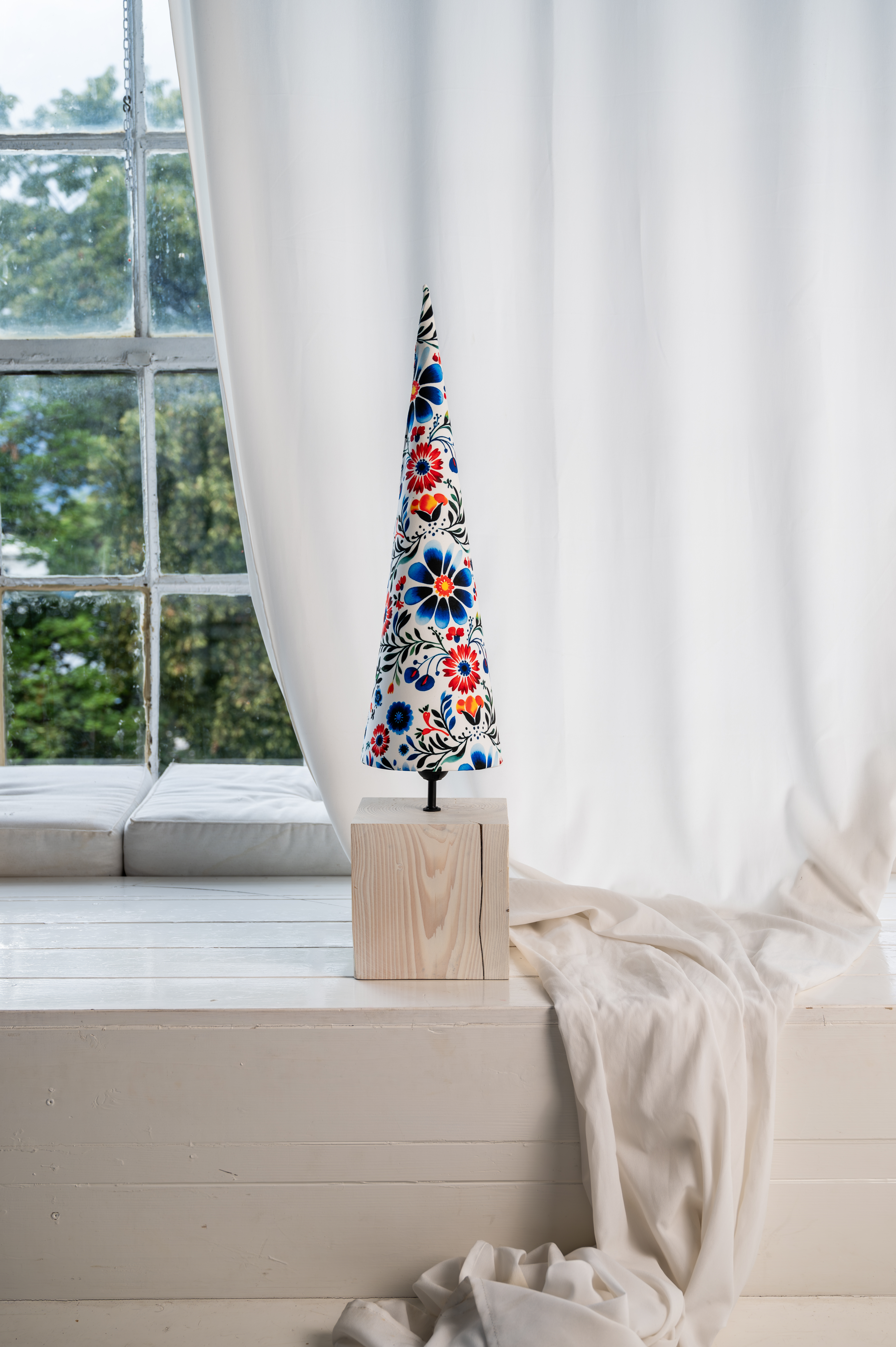 Dřevěný smrkový podstavec s jemným bílým nádechem a kuželovité stínidlo s výrazným folk motivem