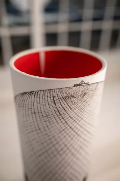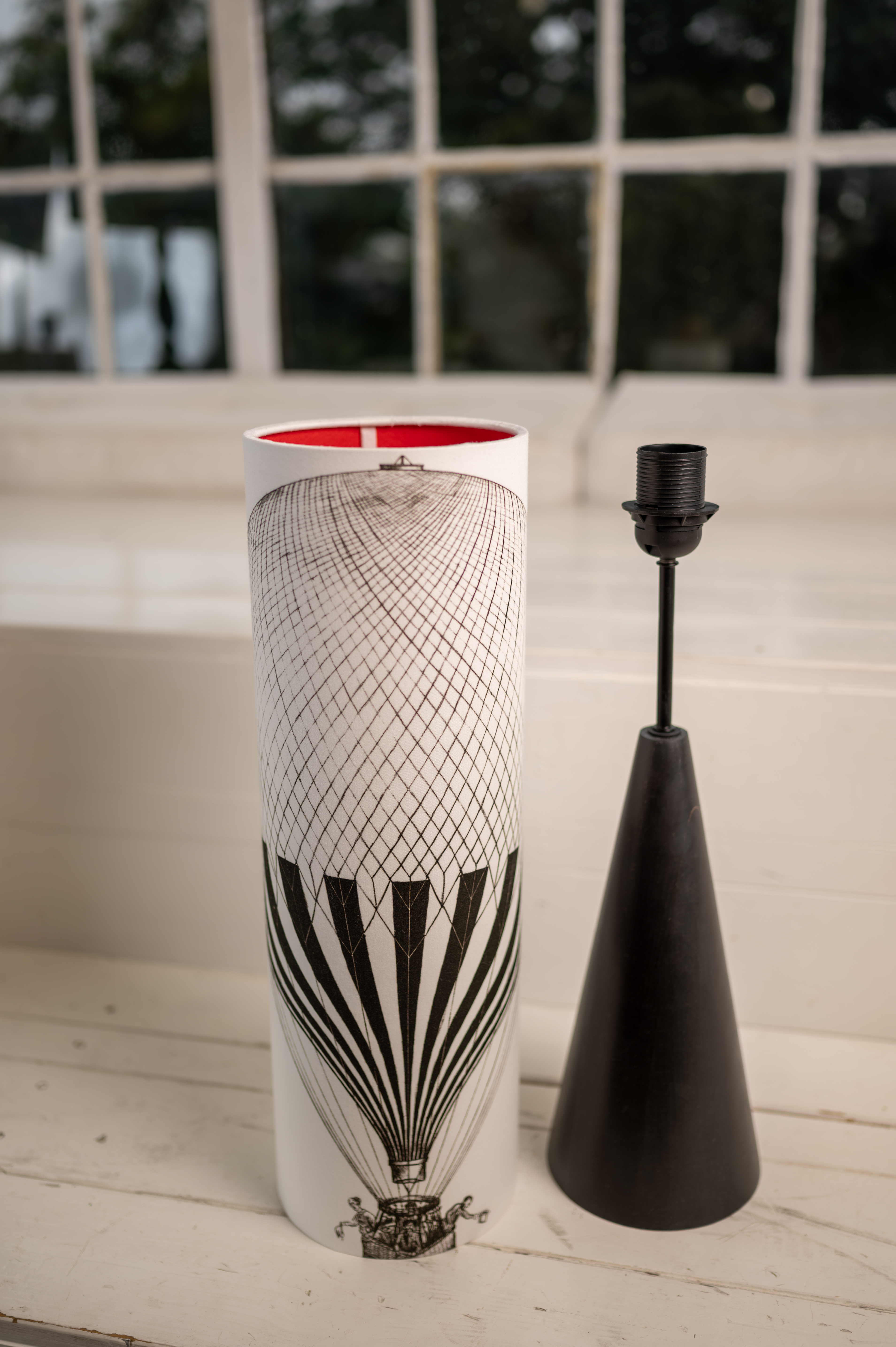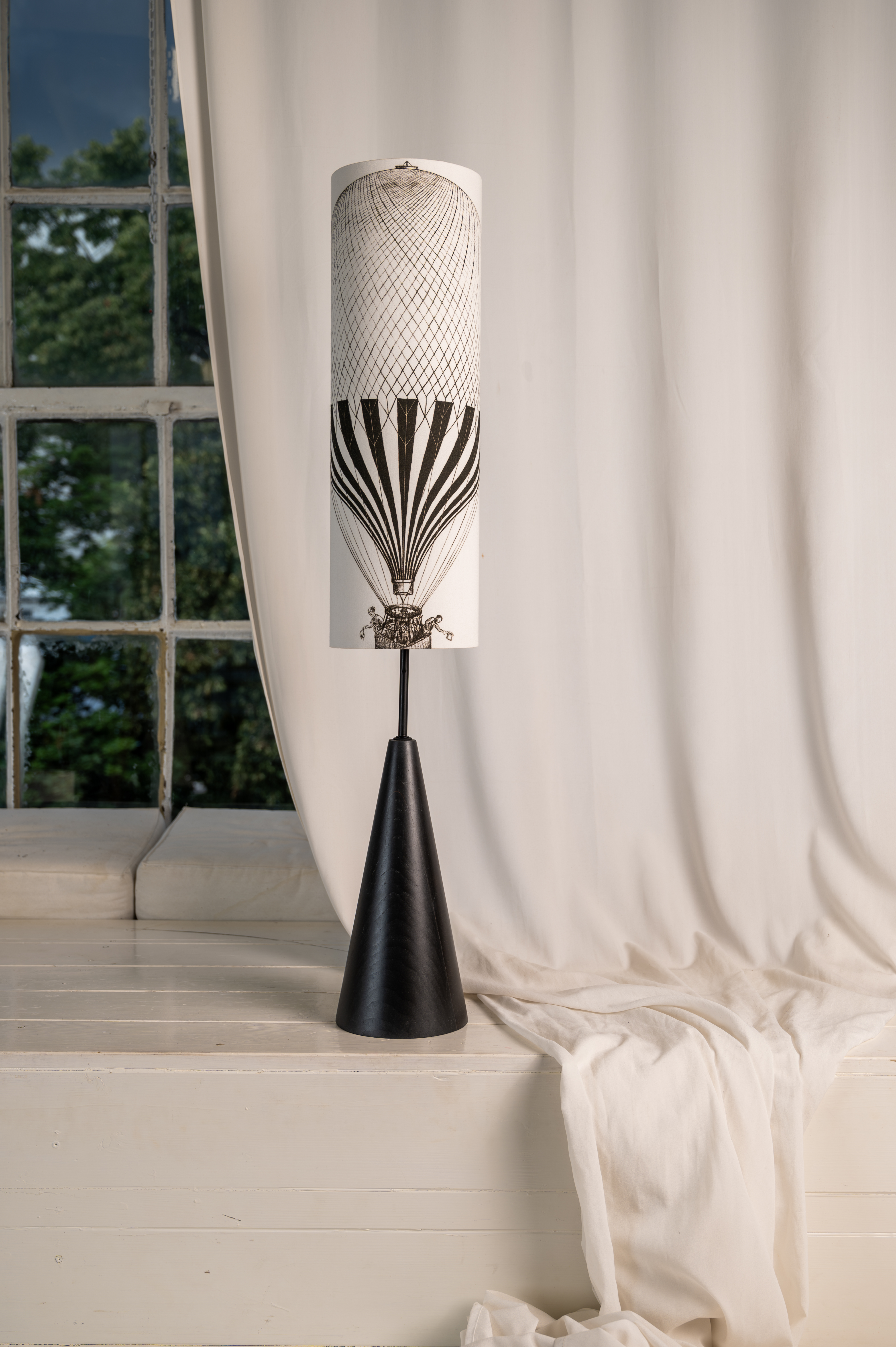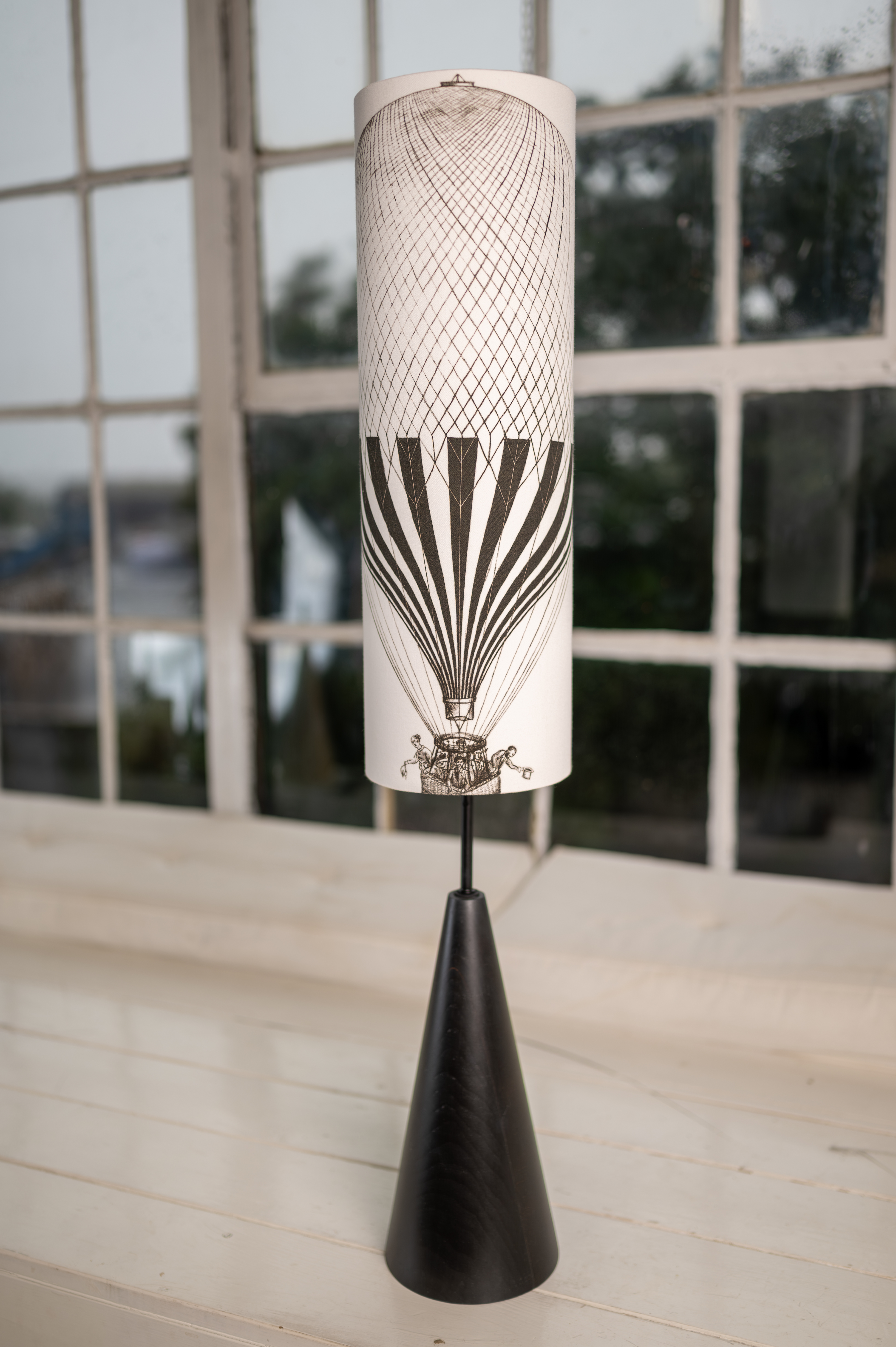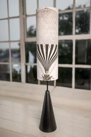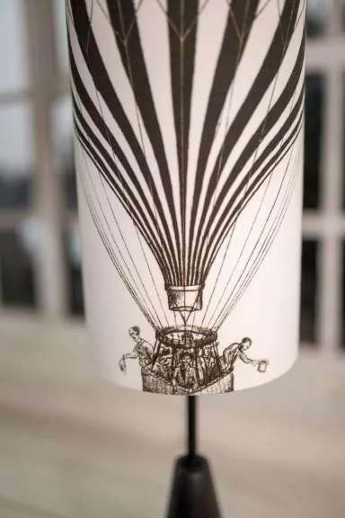 Minimalistický černý podstavec z bukového dřeva doplněný černobílou kresbou horkovzdušného balónu