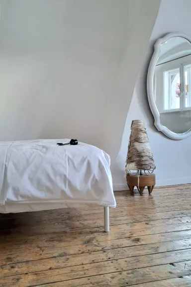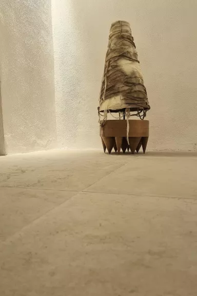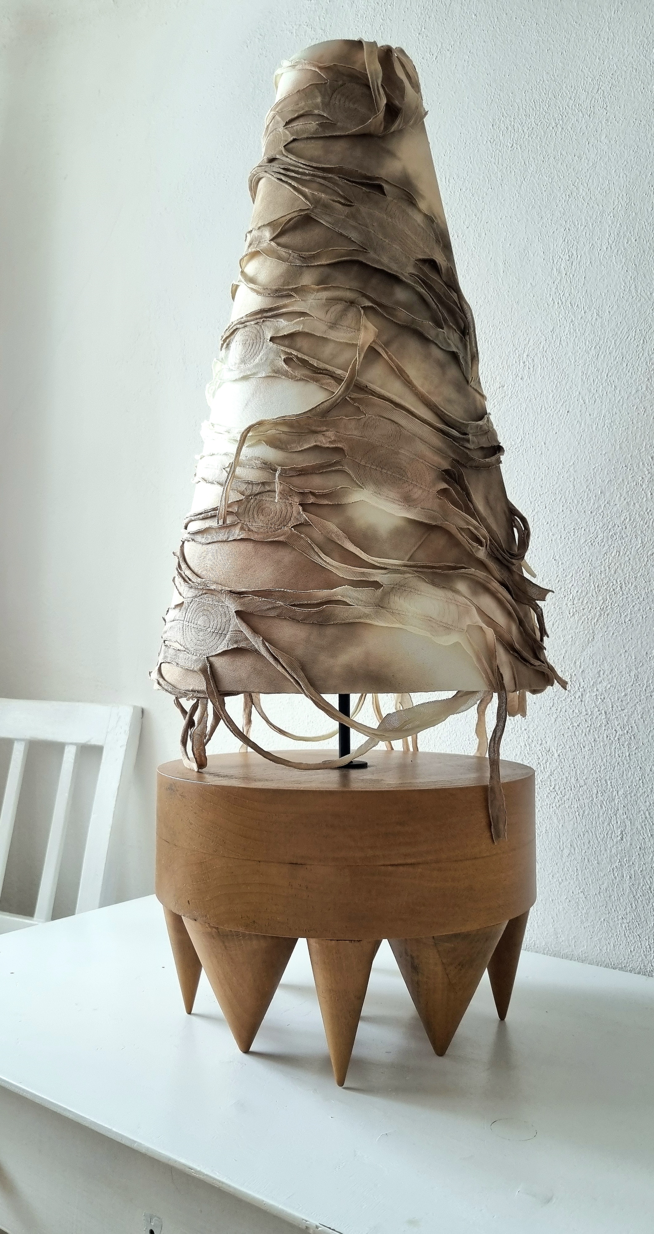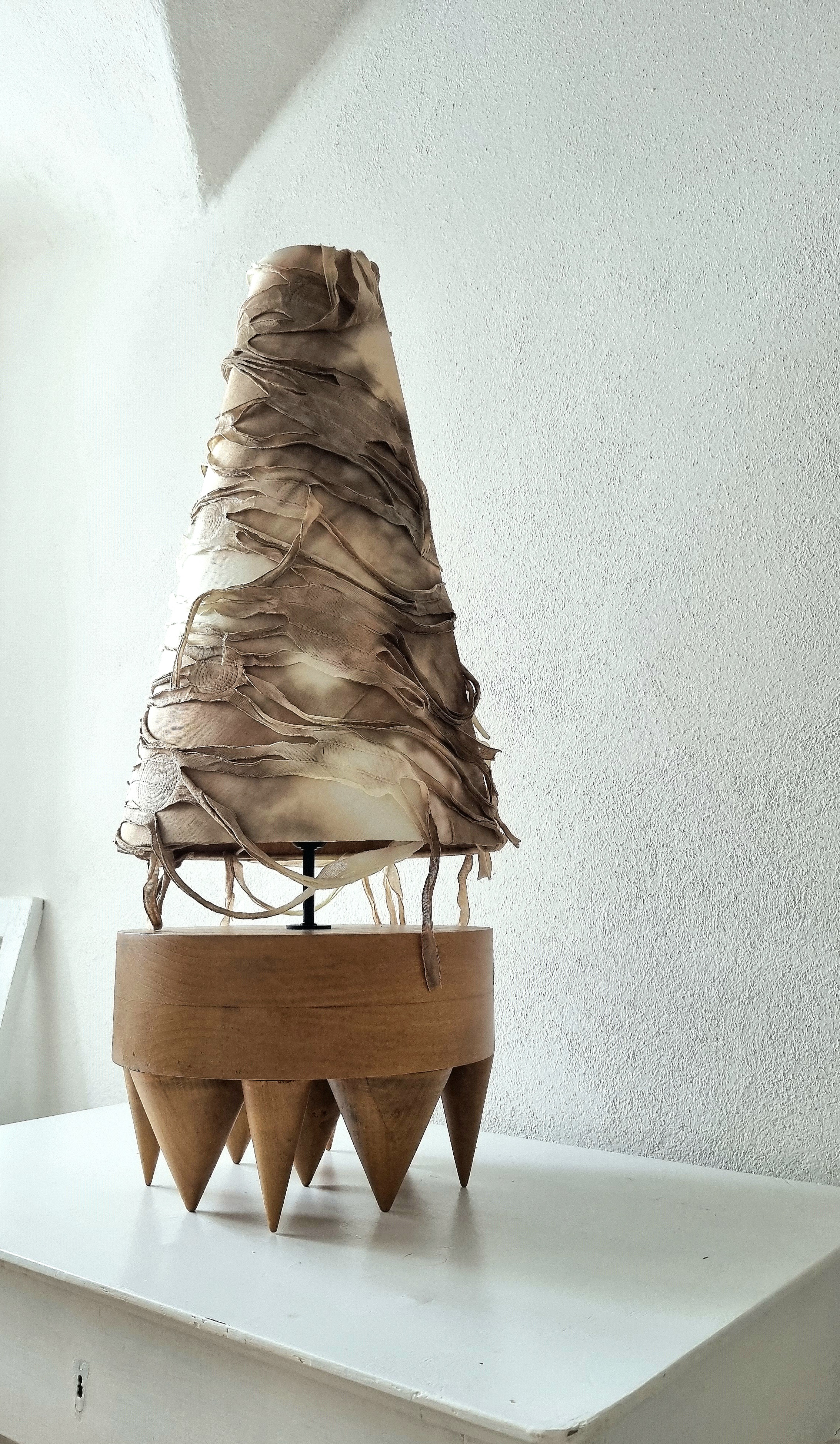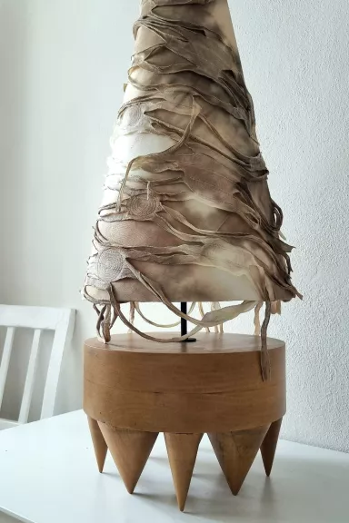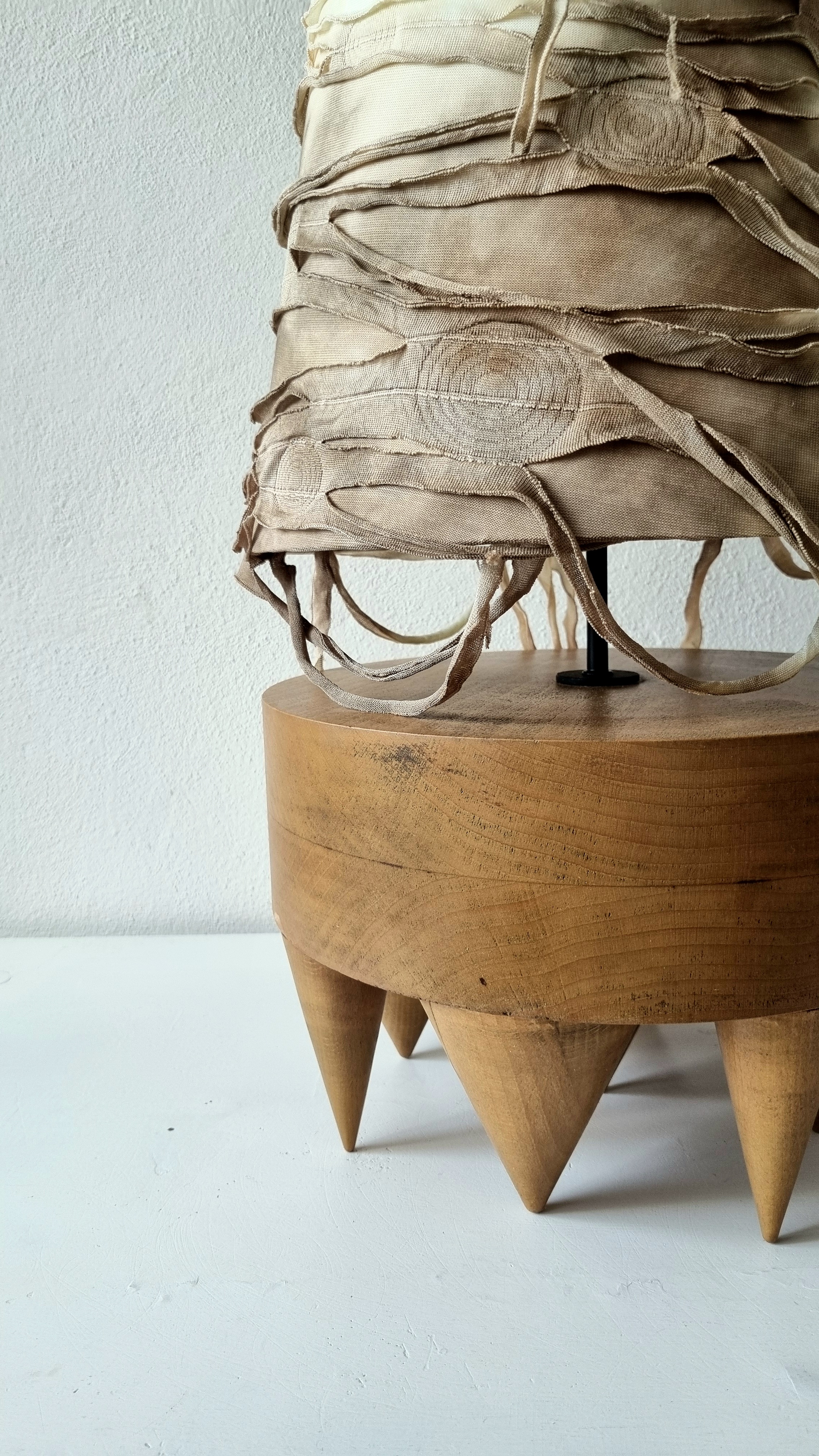 A solid wooden base with sharp conical spikes and an organically layered textile shade in natural tones