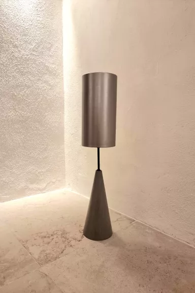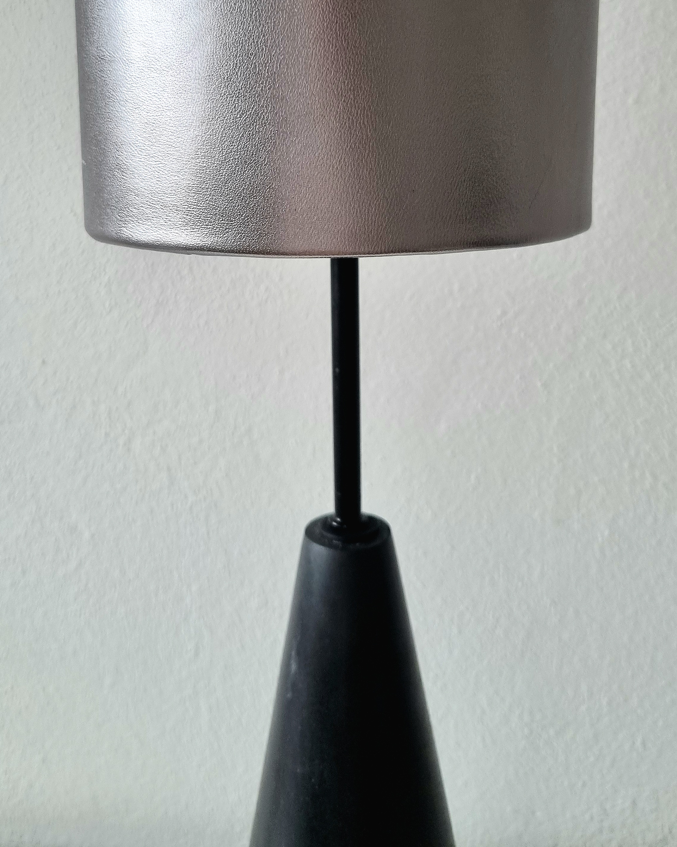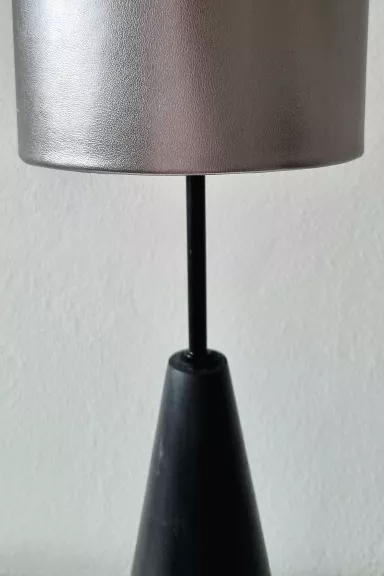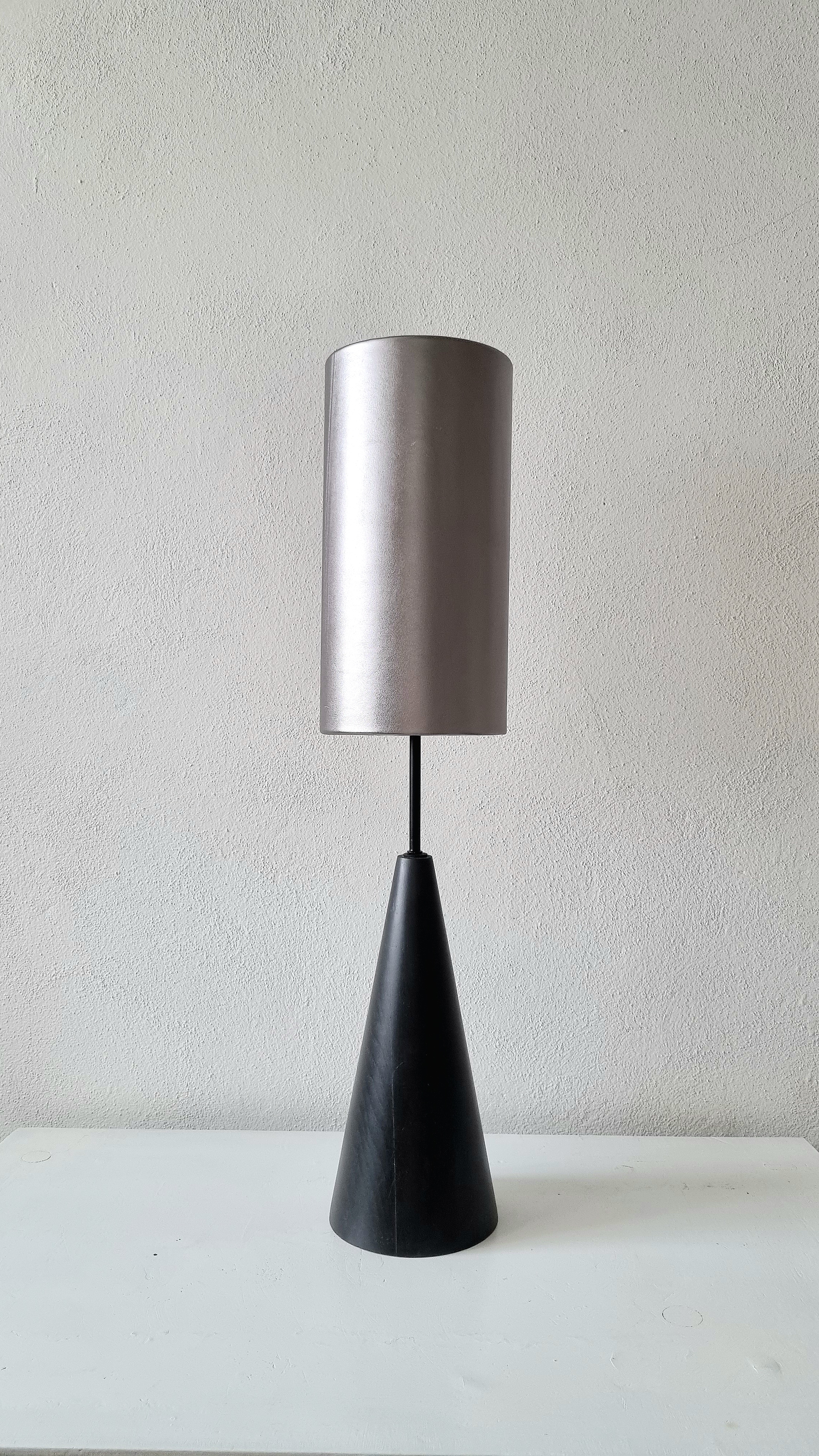 The lamp combines an elegant silver leather shade with a black beech wood base