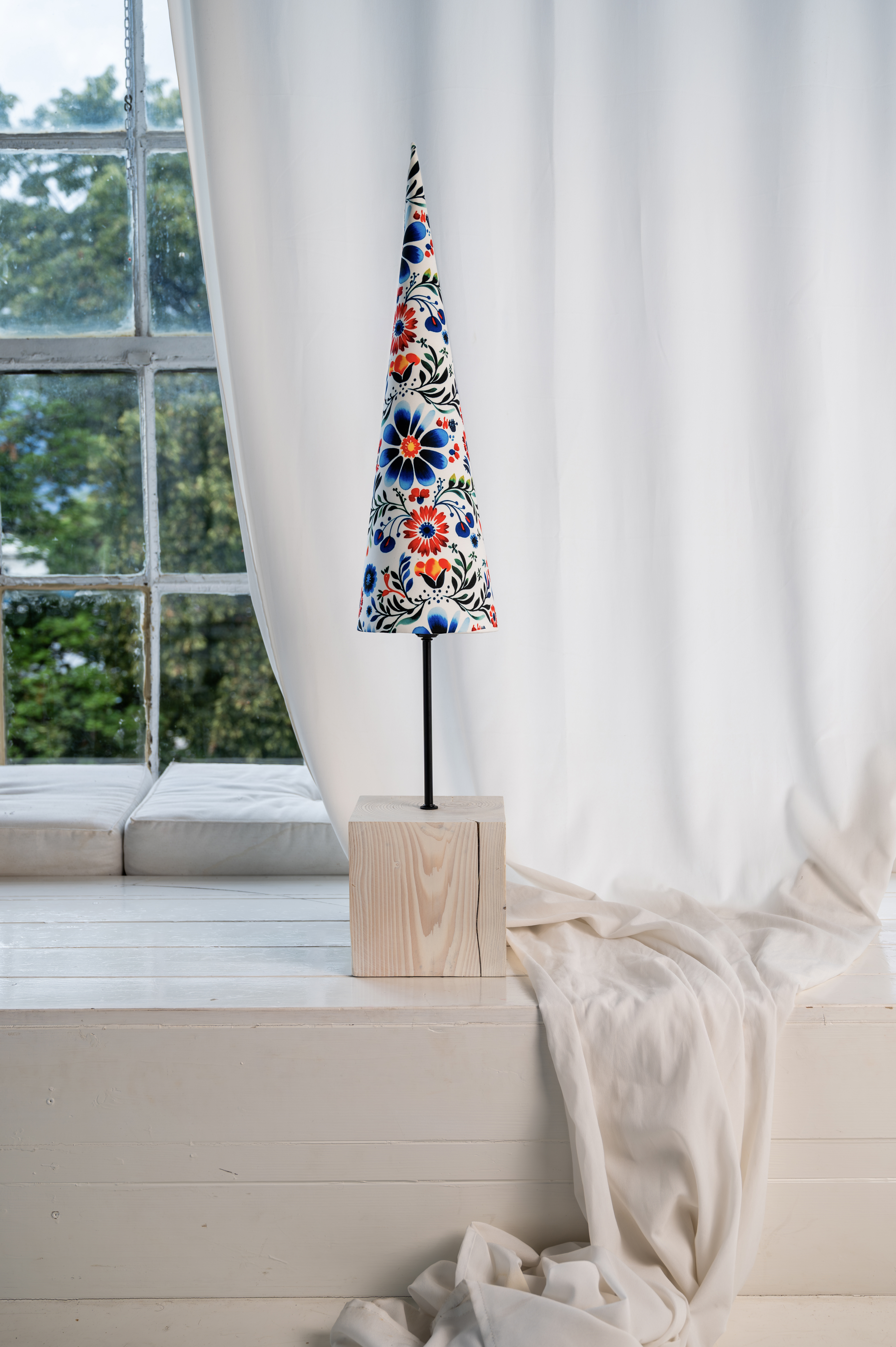 Dřevěný smrkový podstavec s jemným bílým nádechem a kuželovité stínidlo s výrazným folk motivem